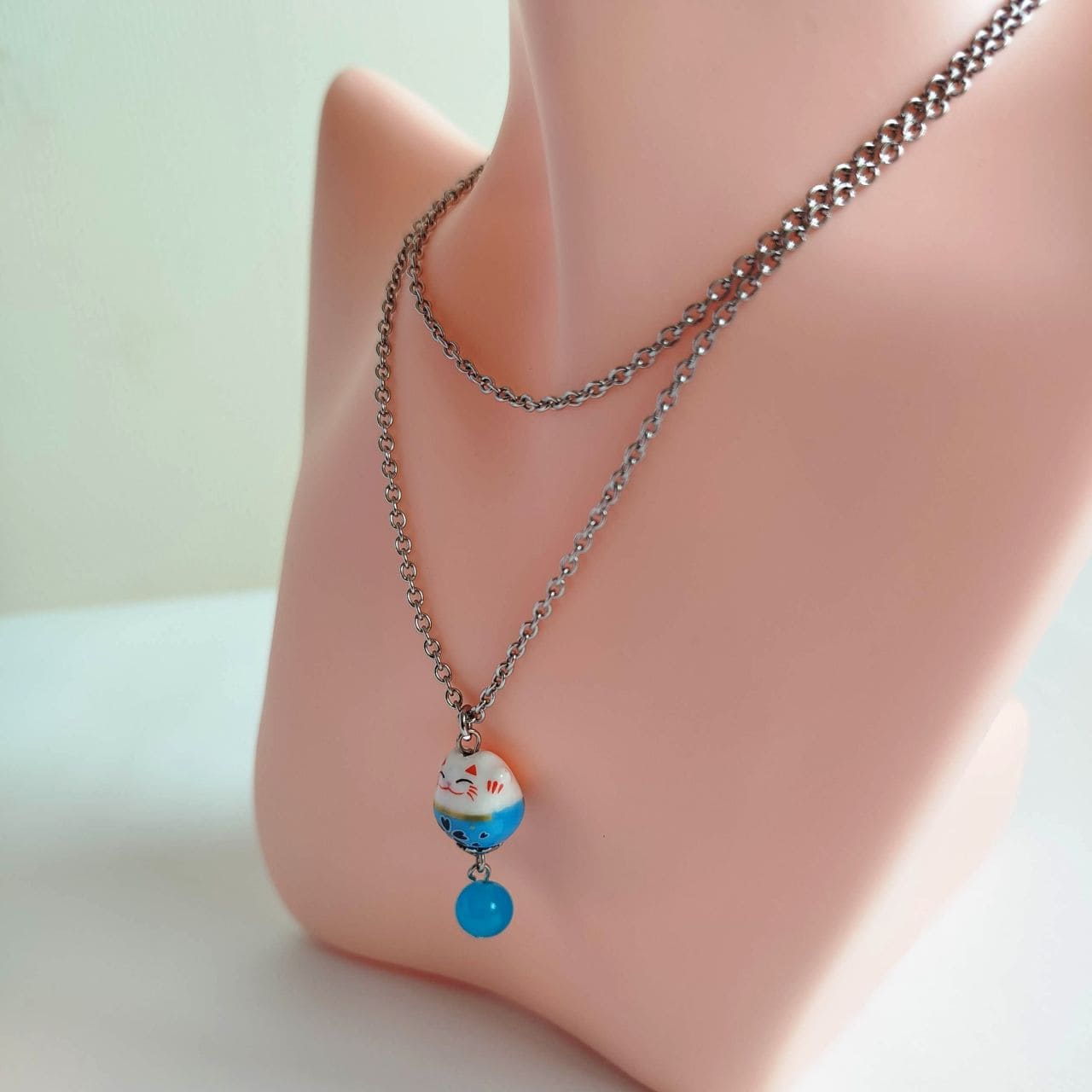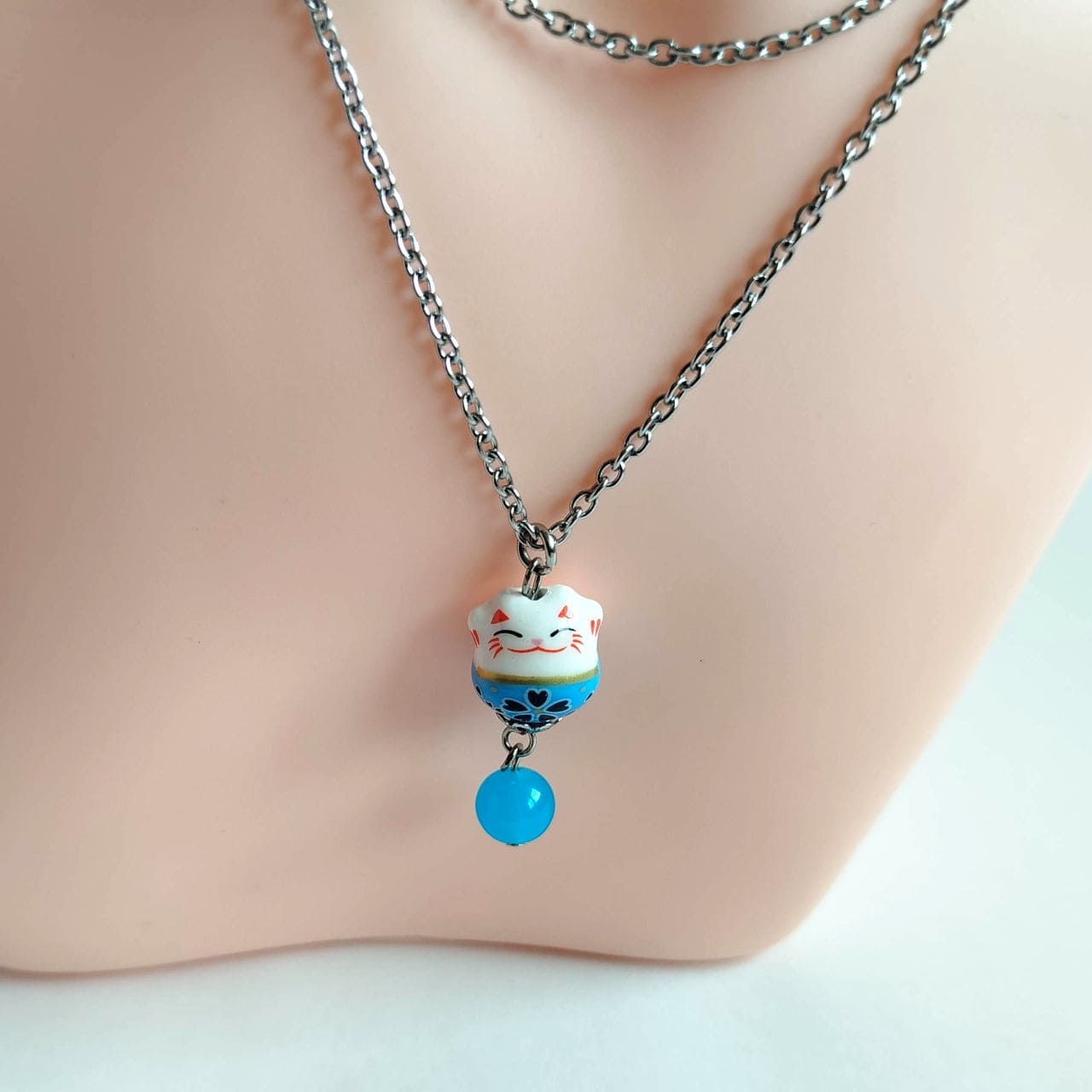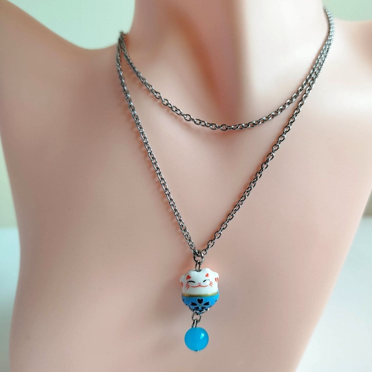 Collana con Maneki-neko in porcellana azzurro chiaro, con entrambe le zampine alzate per invitare fortuna e buone relazioni.