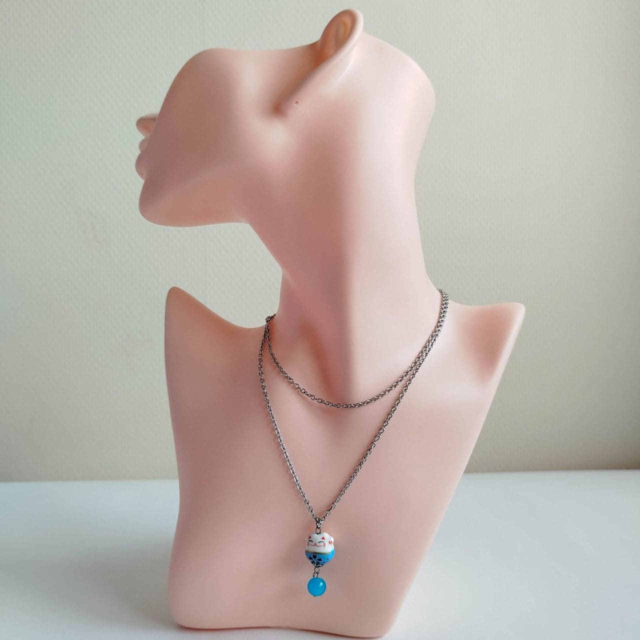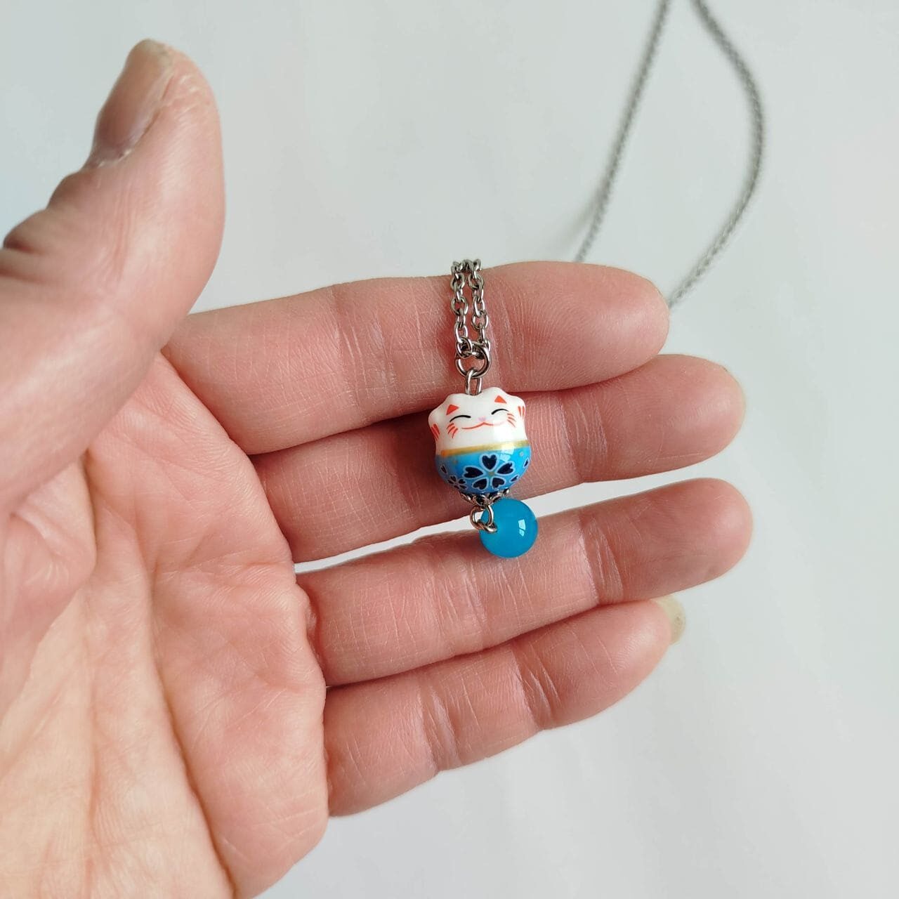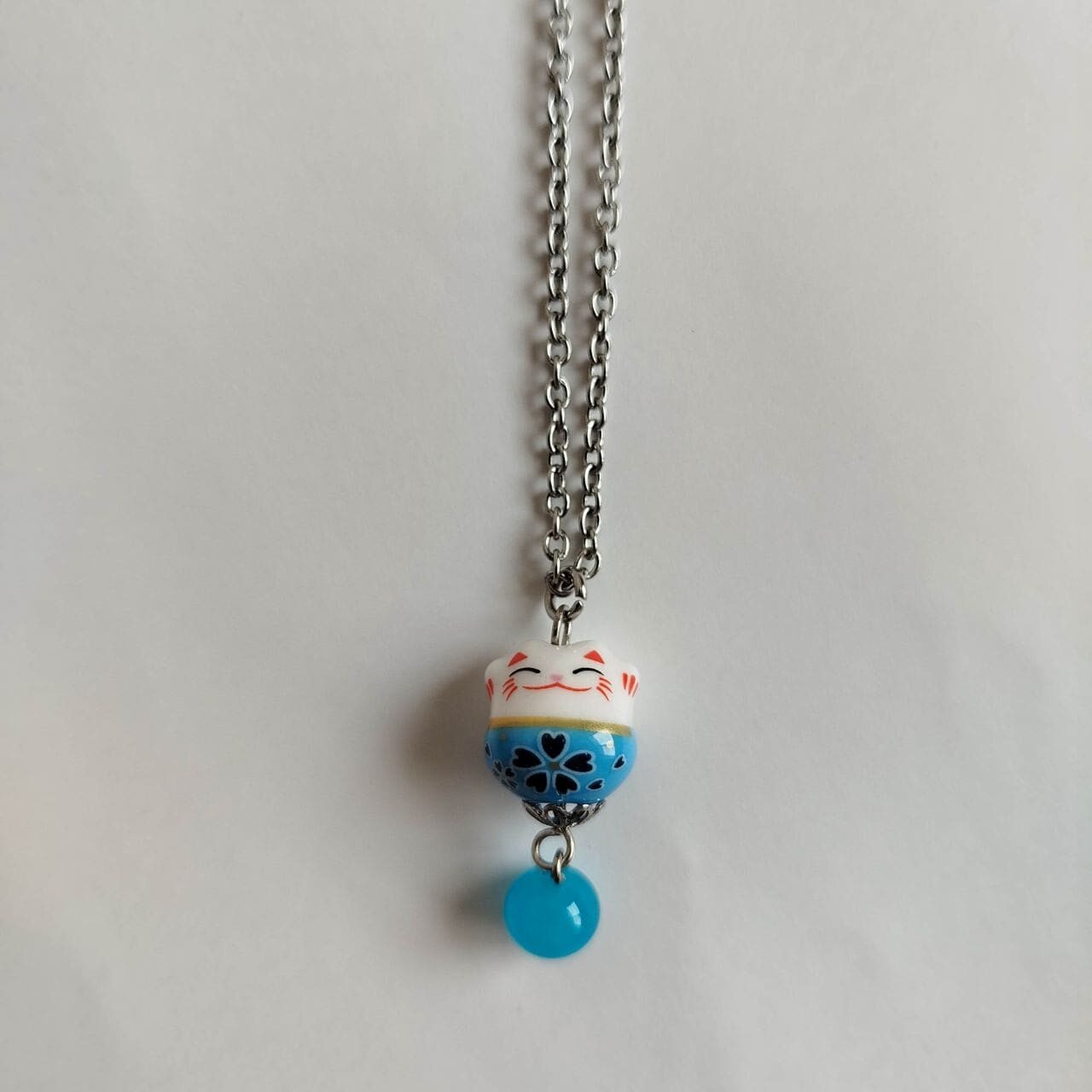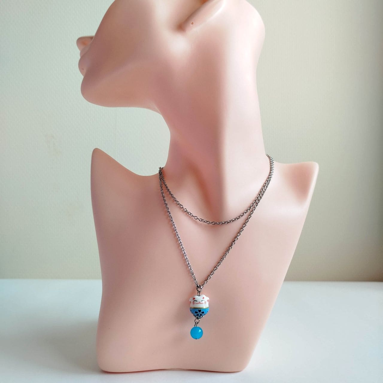 Collana con Maneki-neko in porcellana azzurro chiaro, con entrambe le zampine alzate per invitare fortuna e buone relazioni.