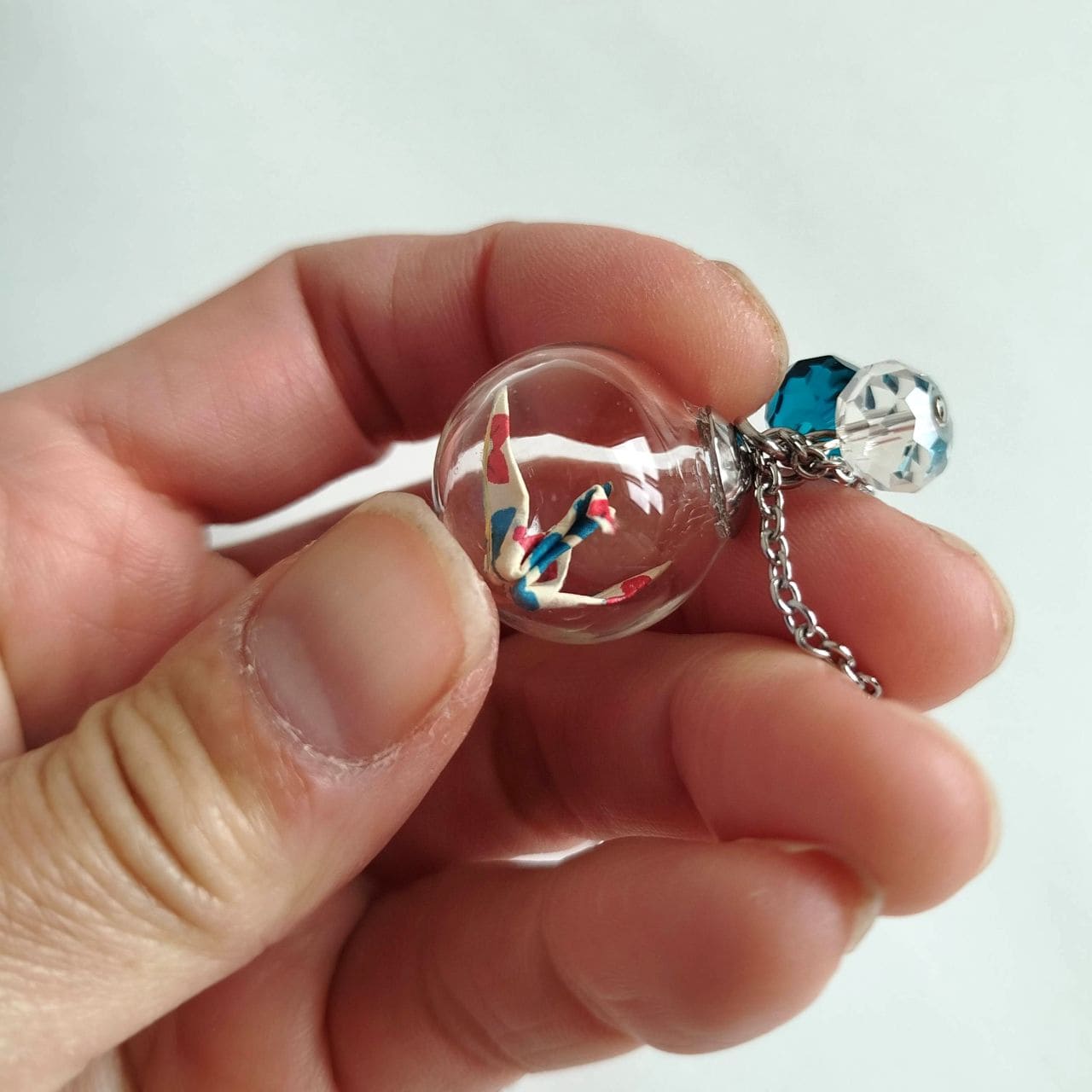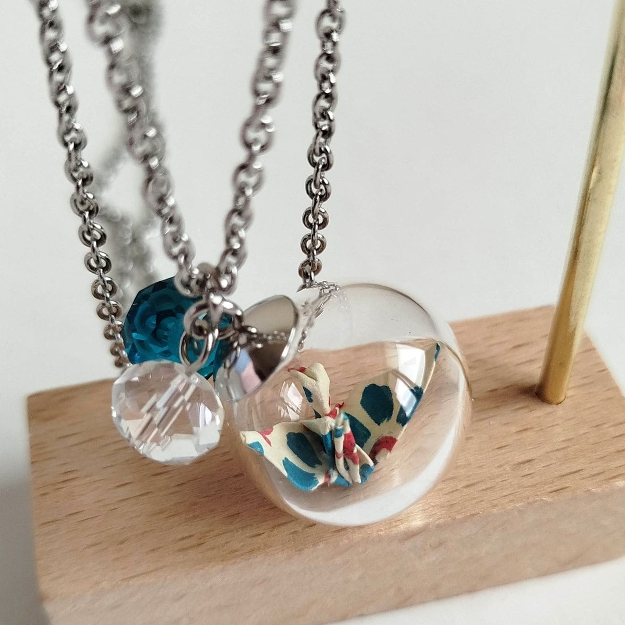 All’interno di una sfera di vetro (circa 2–3 cm) si trova una gru origami piegata da un quadrato di 3 cm di carta Varese, dai colori vivaci: petali azzurri e dettagli rossi pieni di energia.