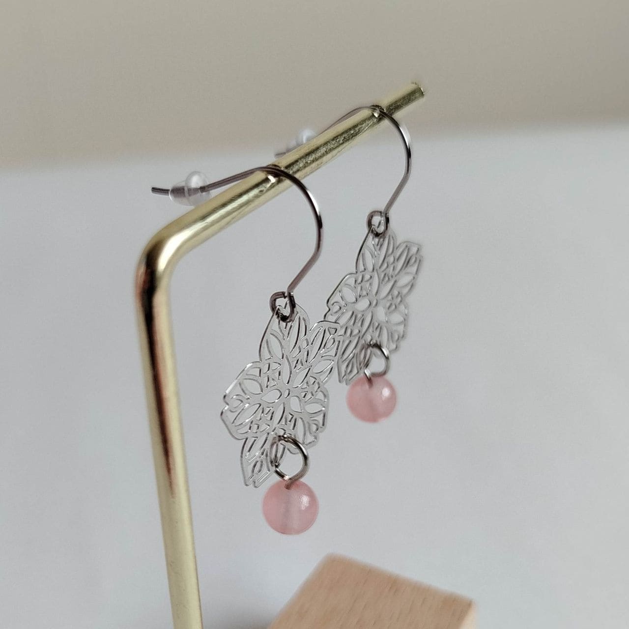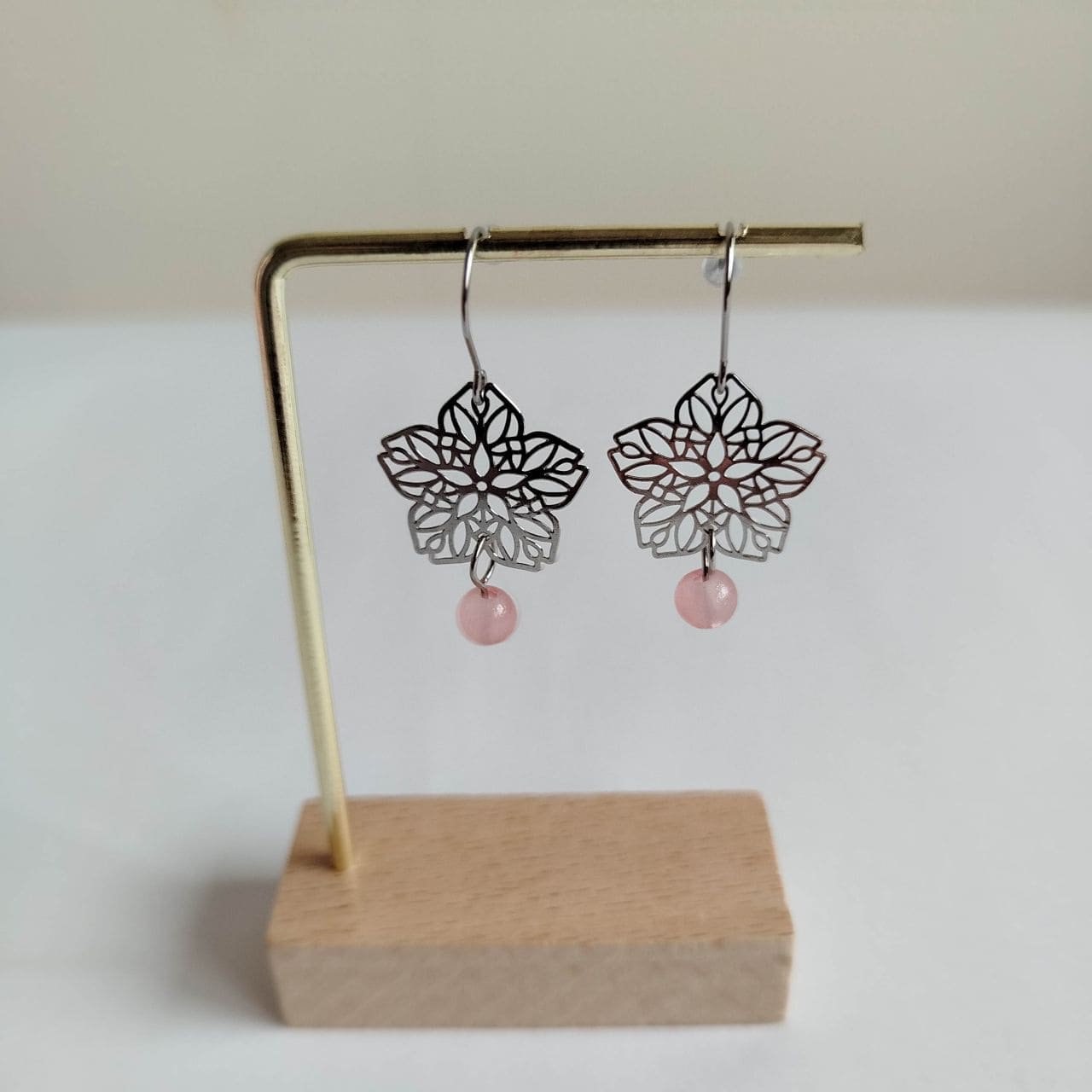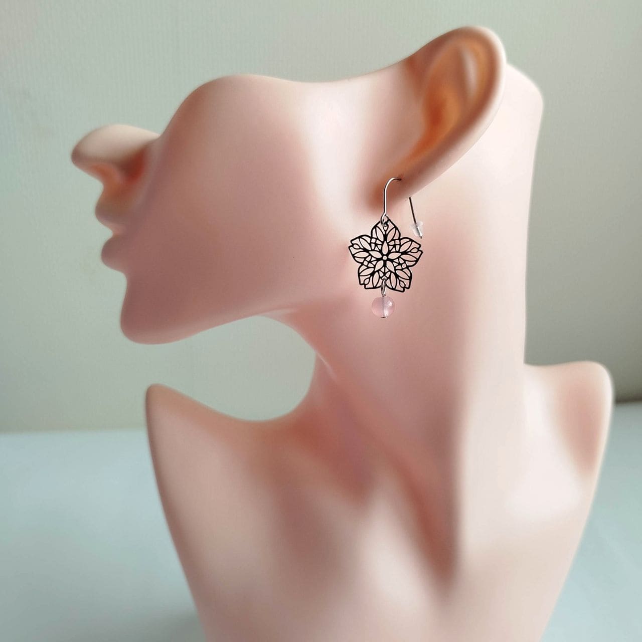 Orecchini Sakura a Filigrana Traforata – Ottone Rodio con Perla Acrilica Rosa Chiaro