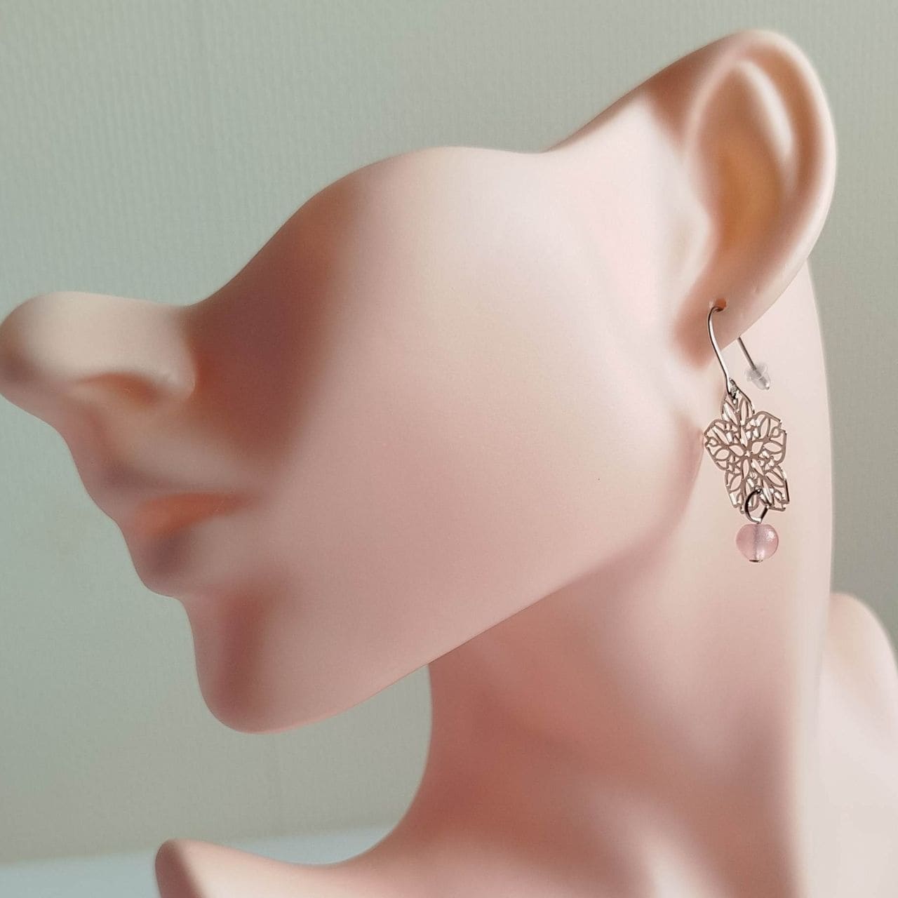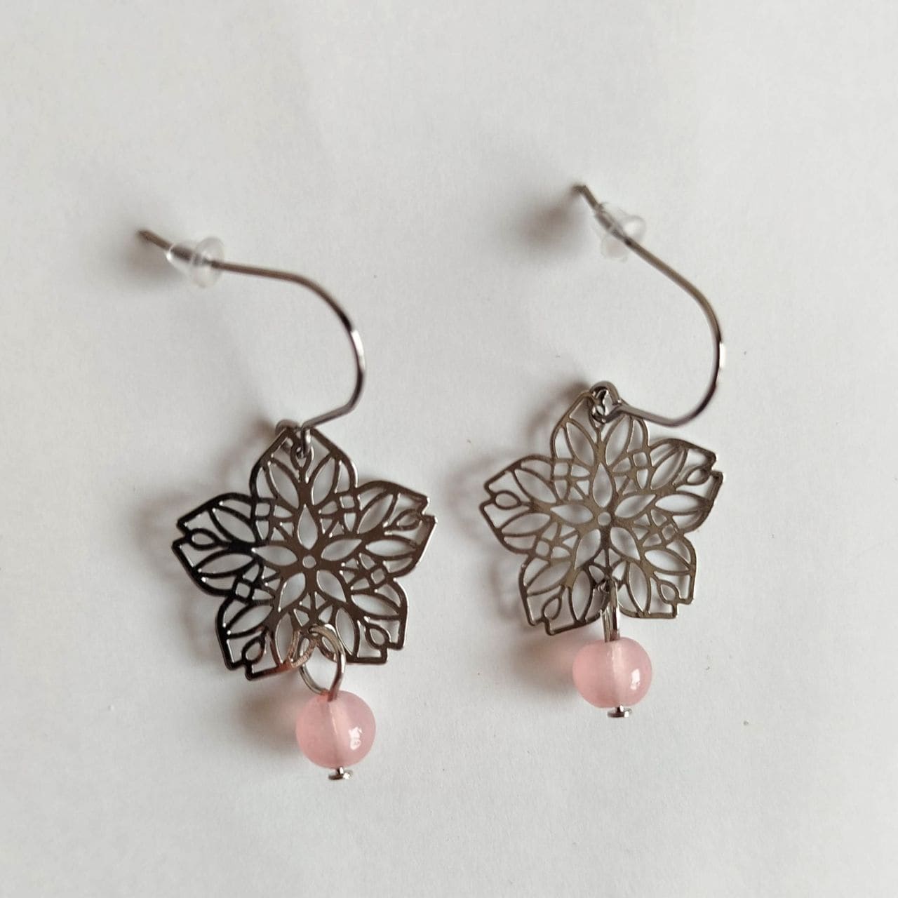 Delicati orecchini con sakura a filigrana traforata in ottone rodio e perla rosa chiaro. Simbolo di bellezza effimera, eleganza e nuovi inizi. Gancio in acciaio chirurgico. Altezza totale ~3,8 cm. Perfetto regalo per persone care.