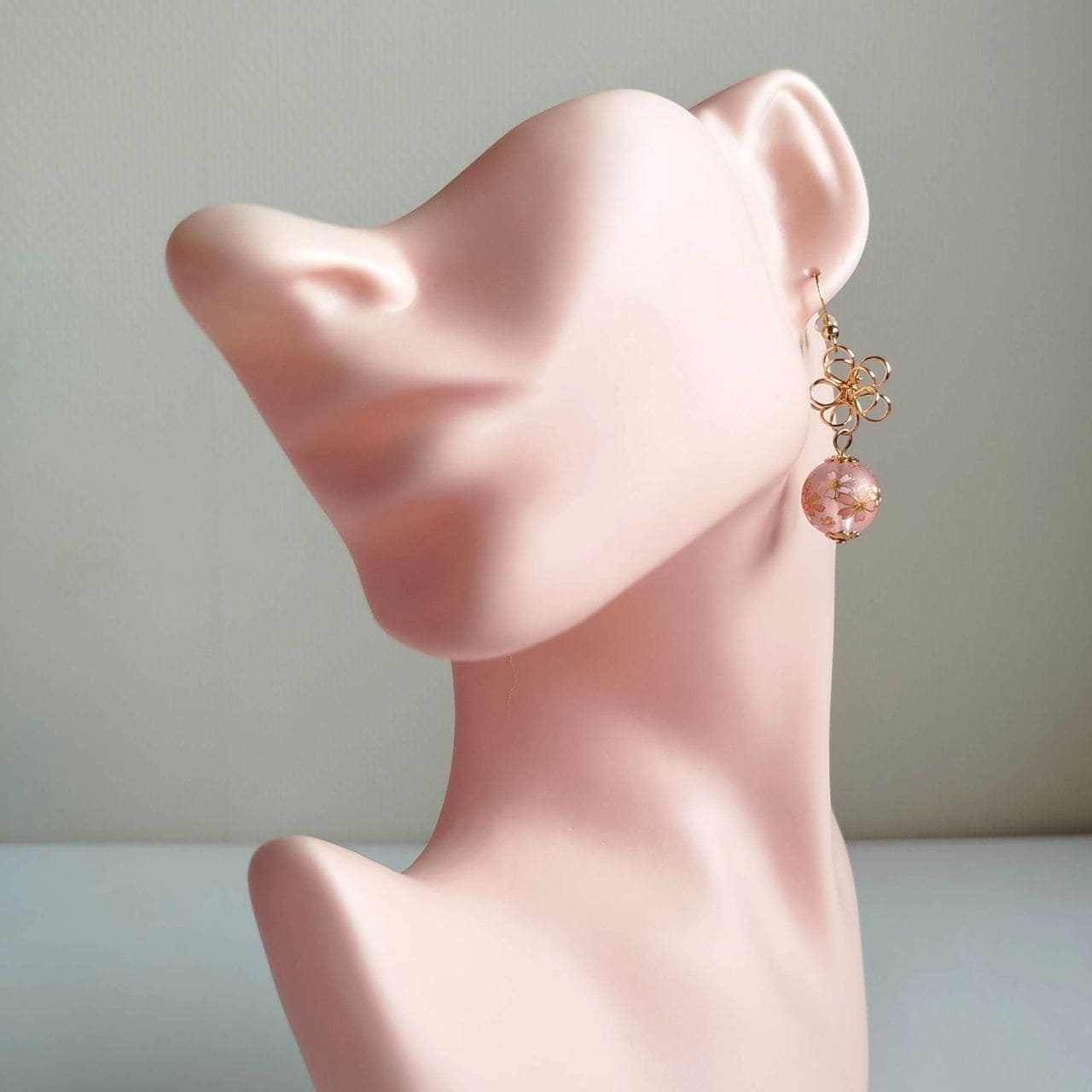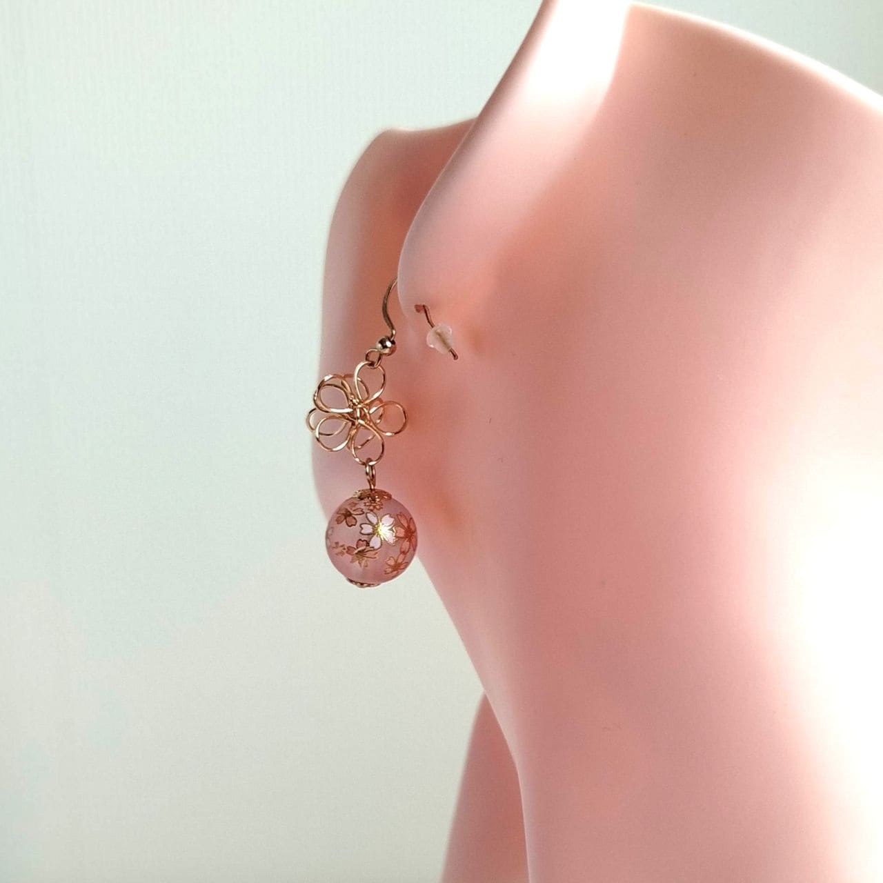 Sospesa sotto, una perla sakura in resina rosa da 14 mm oscilla delicatamente ad ogni movimento.