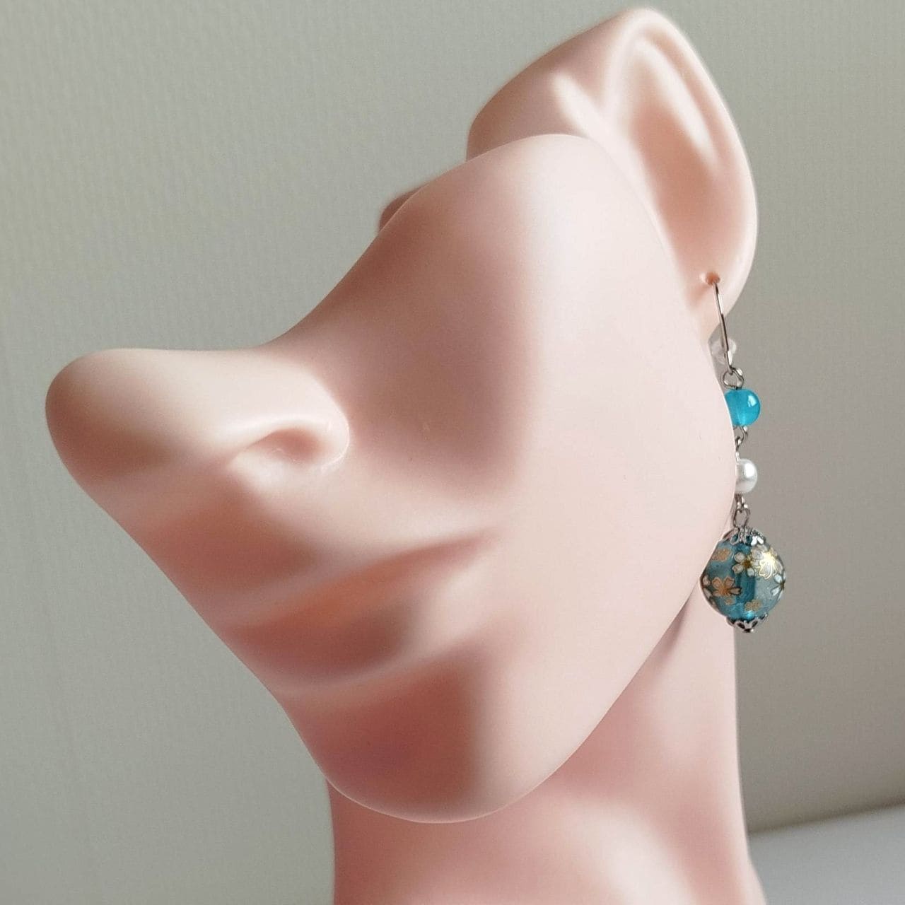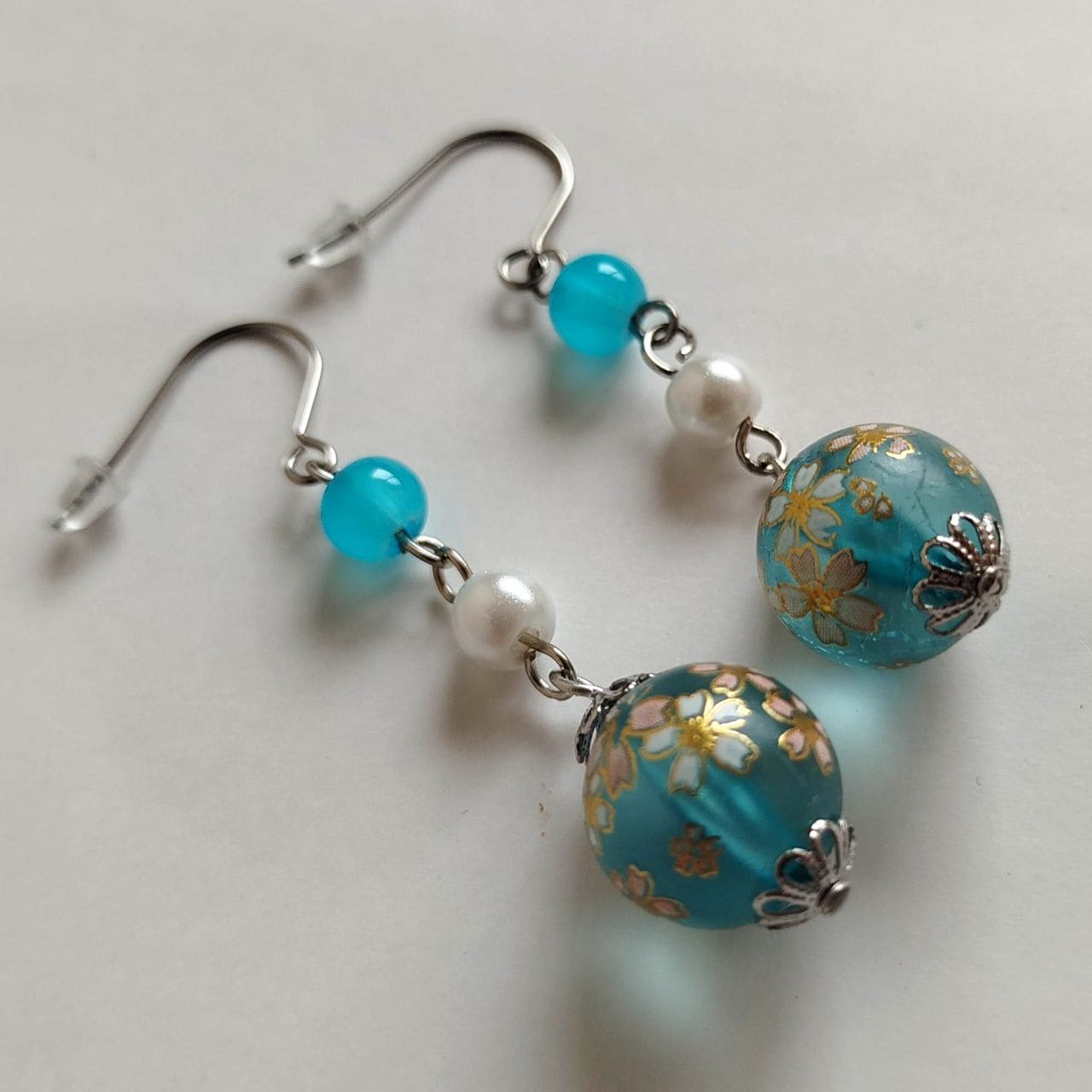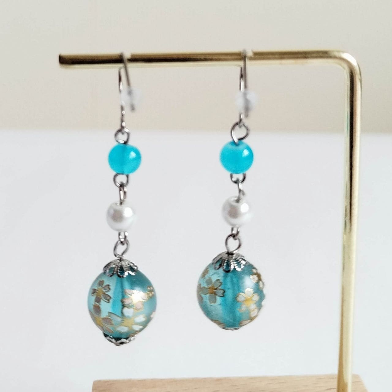 Un elegante paio di orecchini pendenti con delicate tonalità turchese e un raffinato motivo sakura.