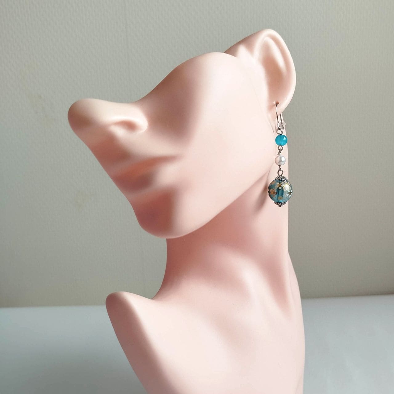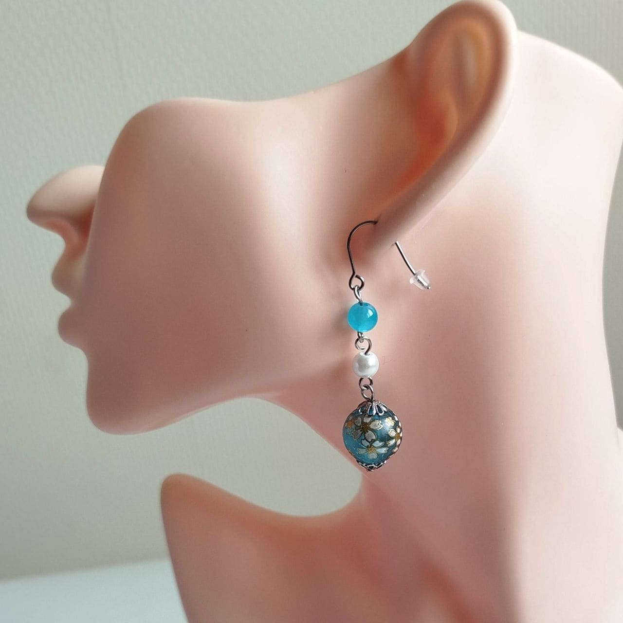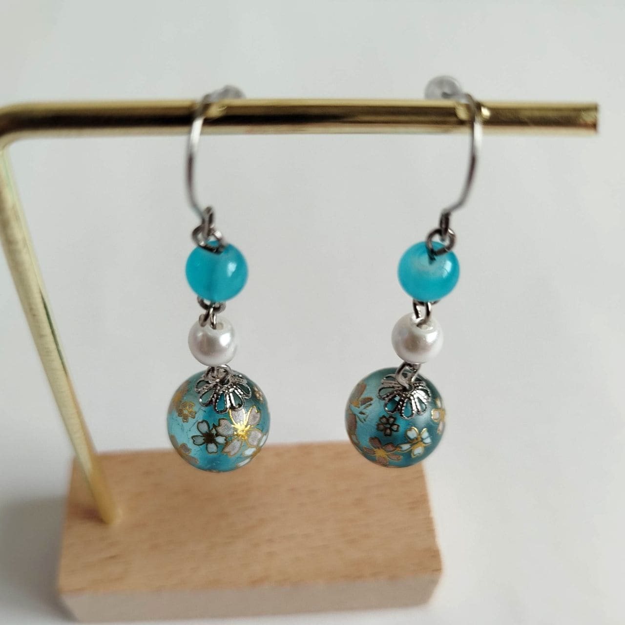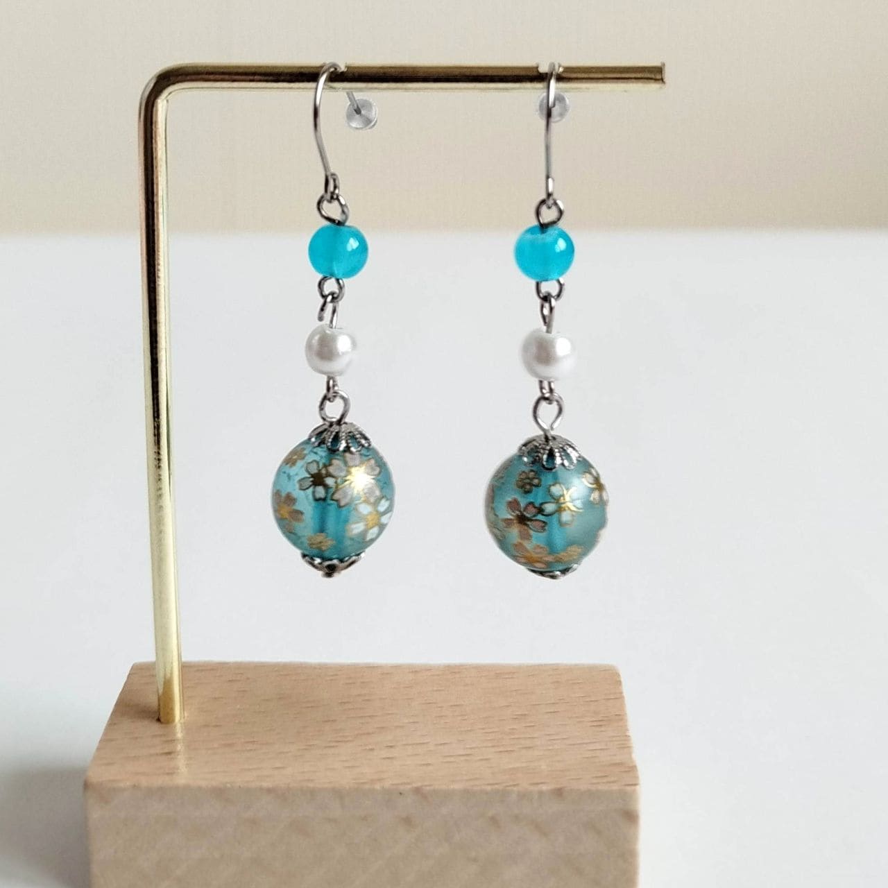 Il design è composto da tre perle disposte in verticale: una perla in vetro bianco da 6 mm, una perla in vetro effetto giada dipinta (baking painted) da 6,5 mm in colore turchese, e una perla in resina traslucida da 14 mm decorata con motivo sakura. La trasparenza della perla con i fiori di ciliegio dona profondità e leggerezza, creando un effetto arioso ed elegante.