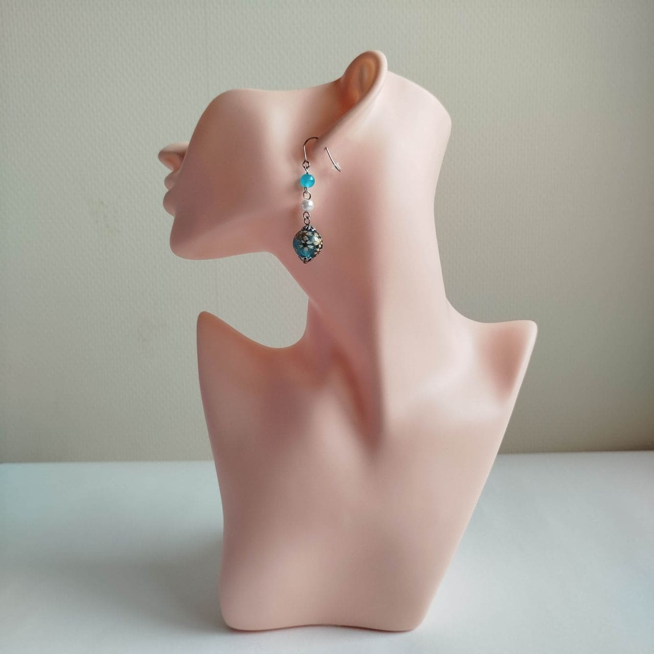 Il contrasto armonioso tra il bianco delicato, il turchese fresco e il motivo floreale esprime una bellezza raffinata e naturale. Leggeri e confortevoli, questi orecchini si muovono con grazia ad ogni passo.