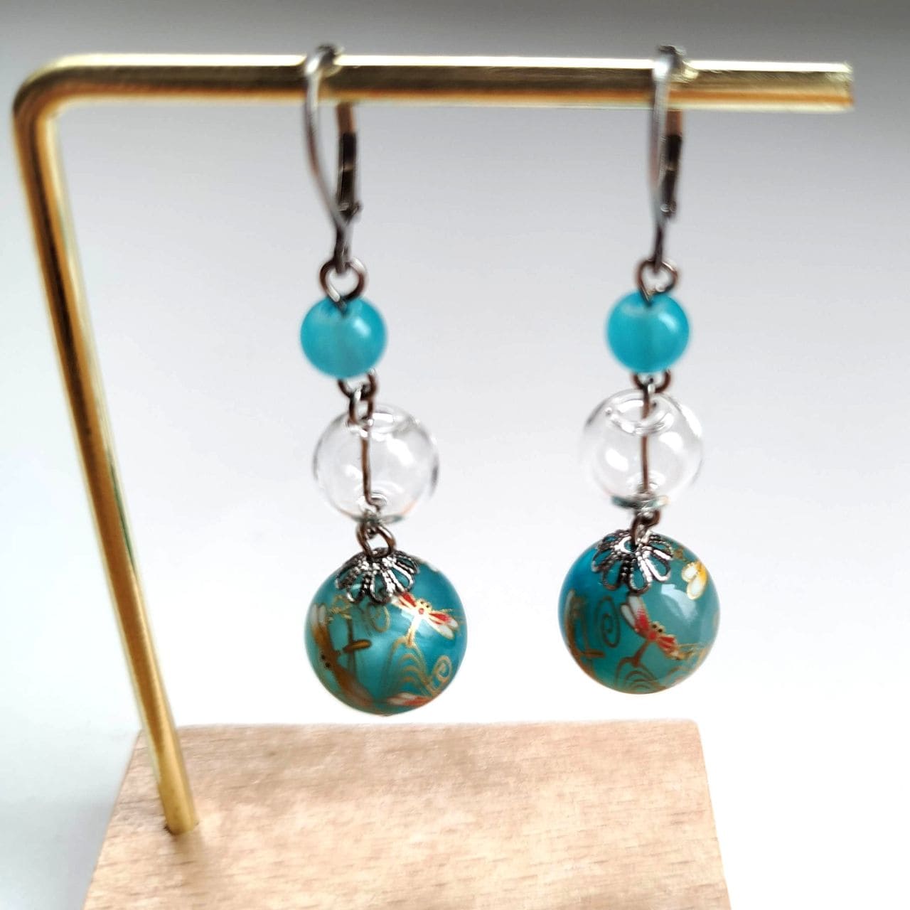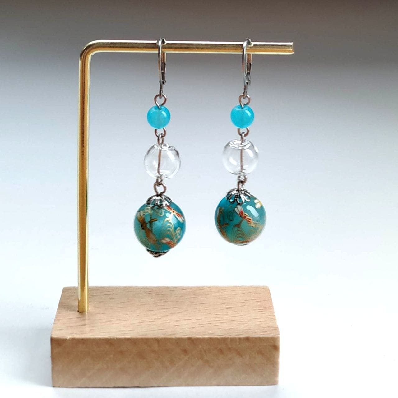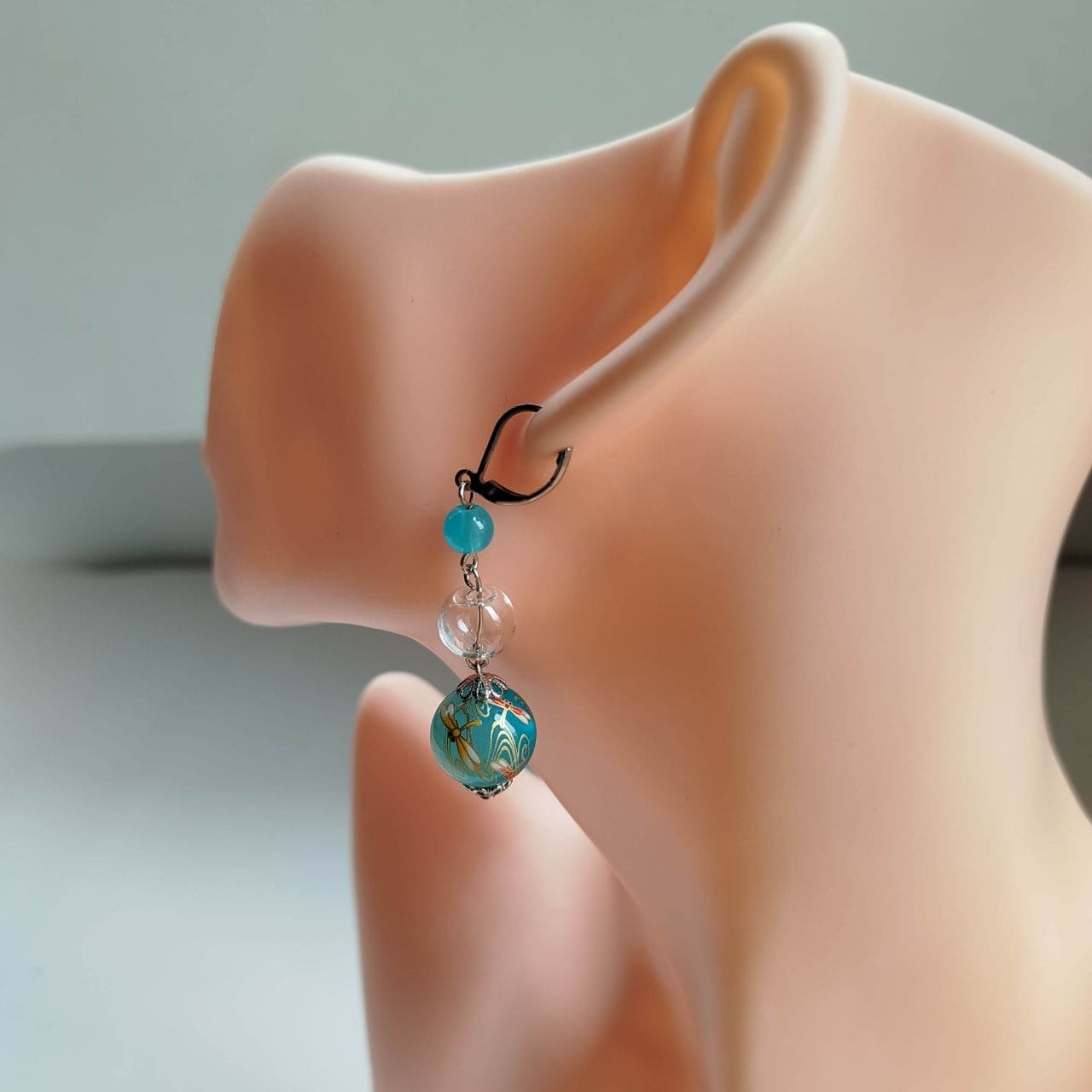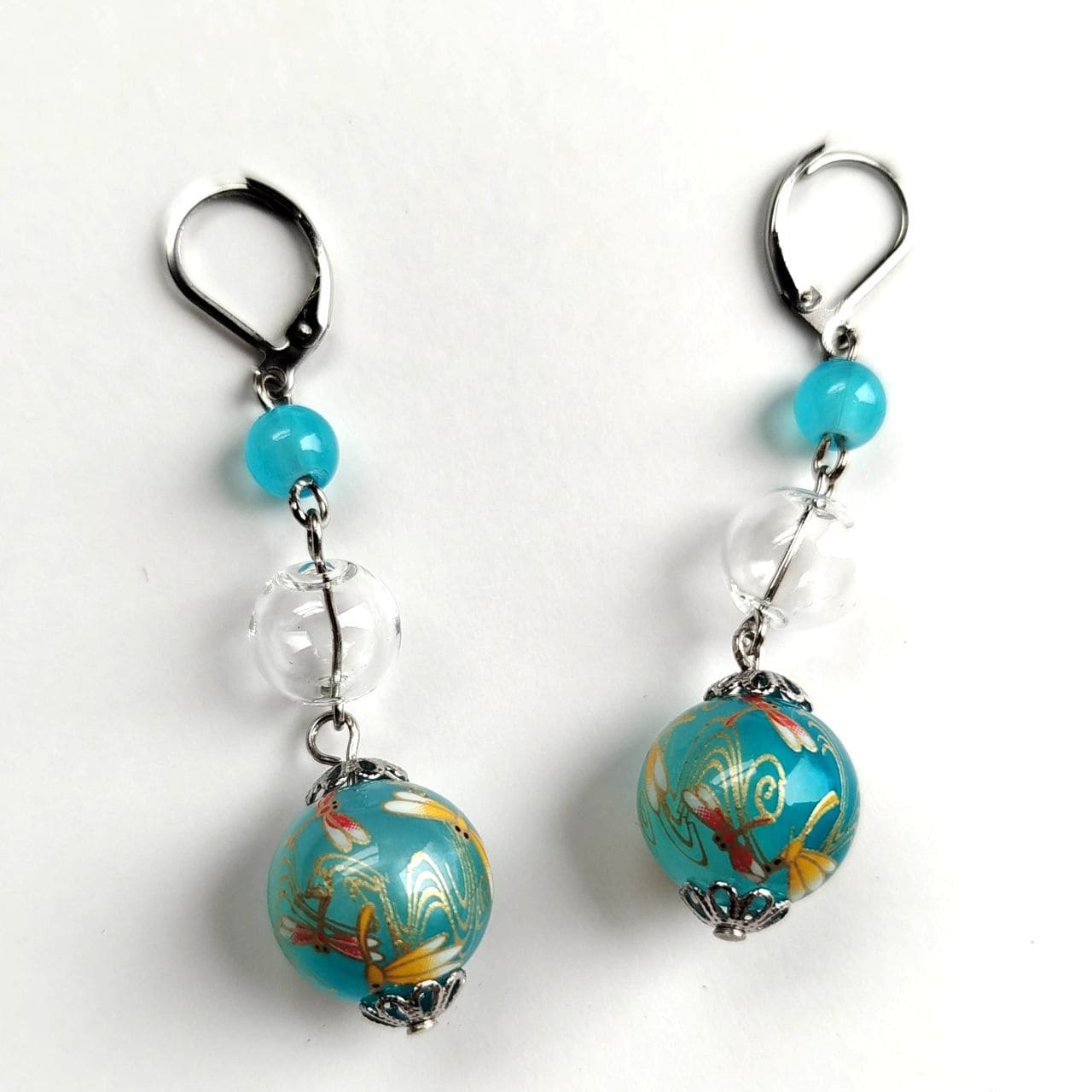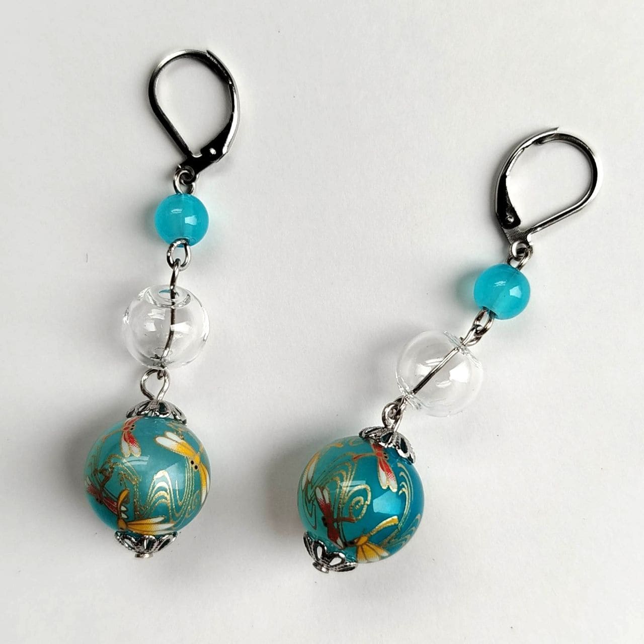 The design combines a 6 mm light blue acrylic bead, a 10 mm hollow blown glass bead, and a 14 mm transfer-decorated bead with a dragonfly pattern. The transparent glass element adds lightness and clarity, creating a cool and airy impression. Total length: approx. 5.8 cm.