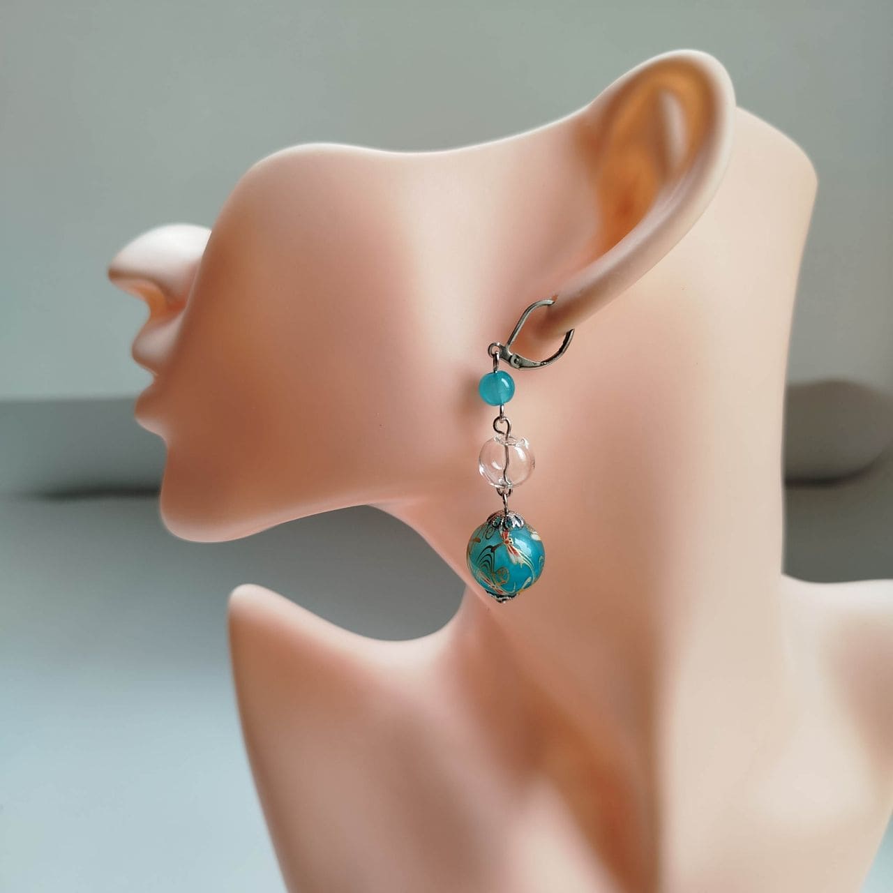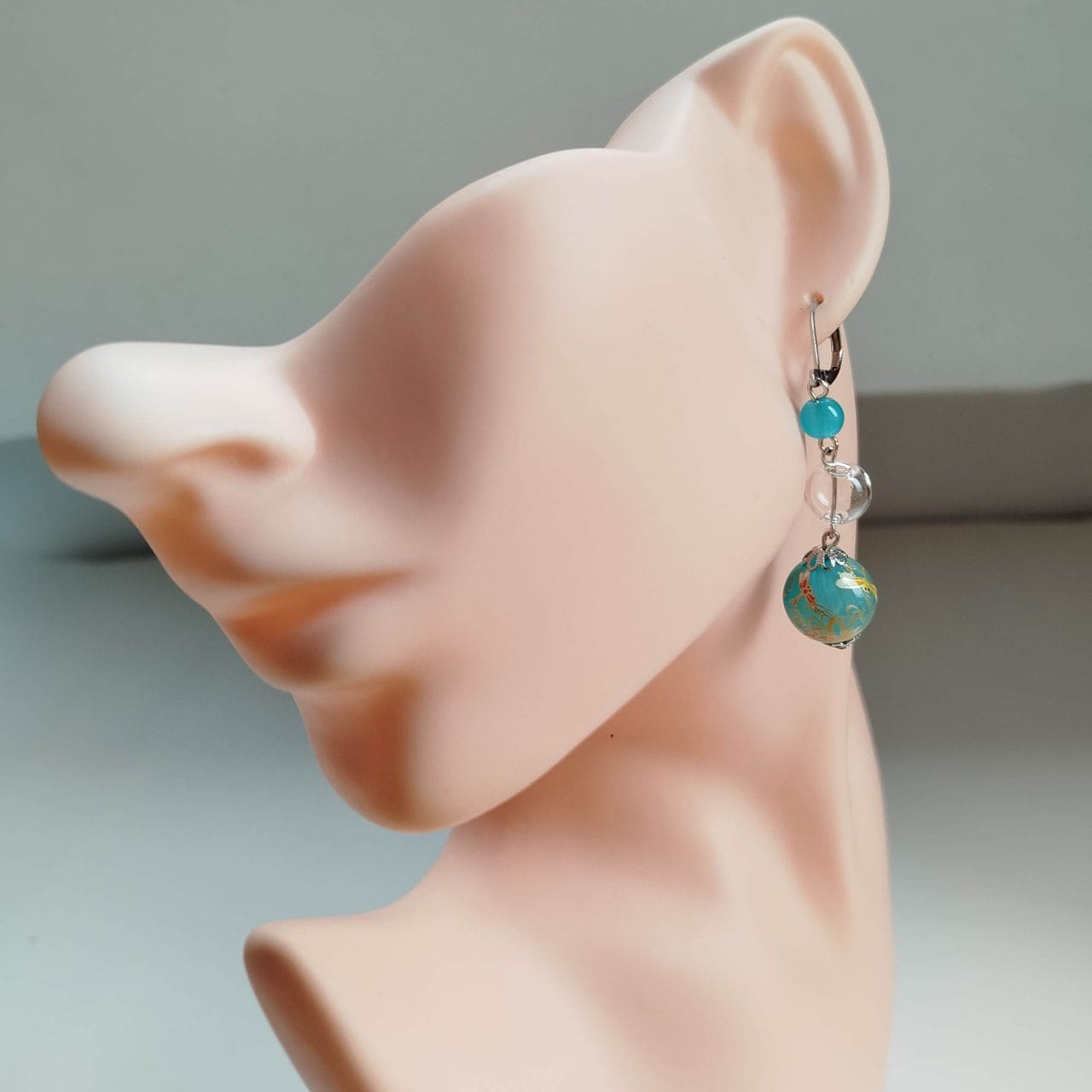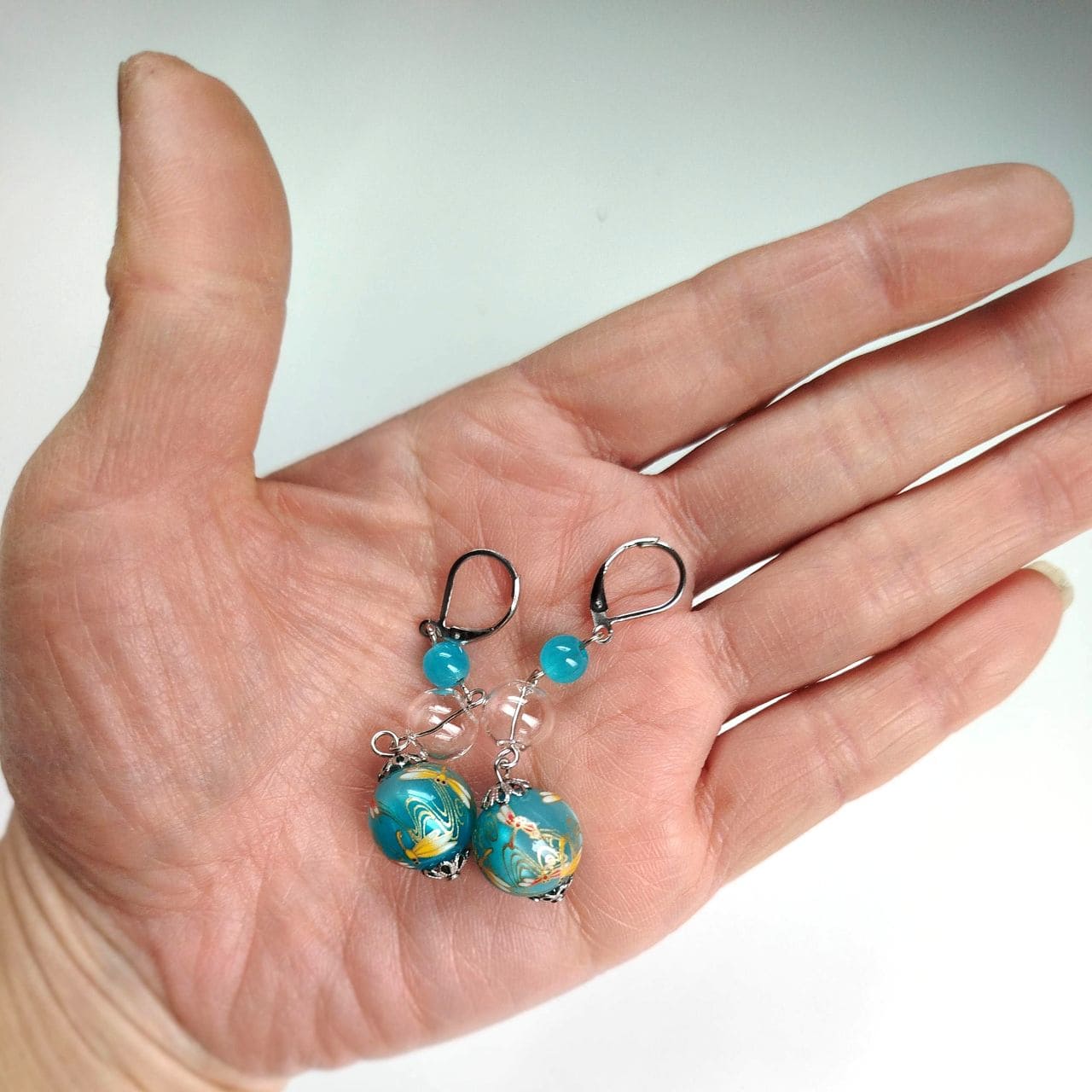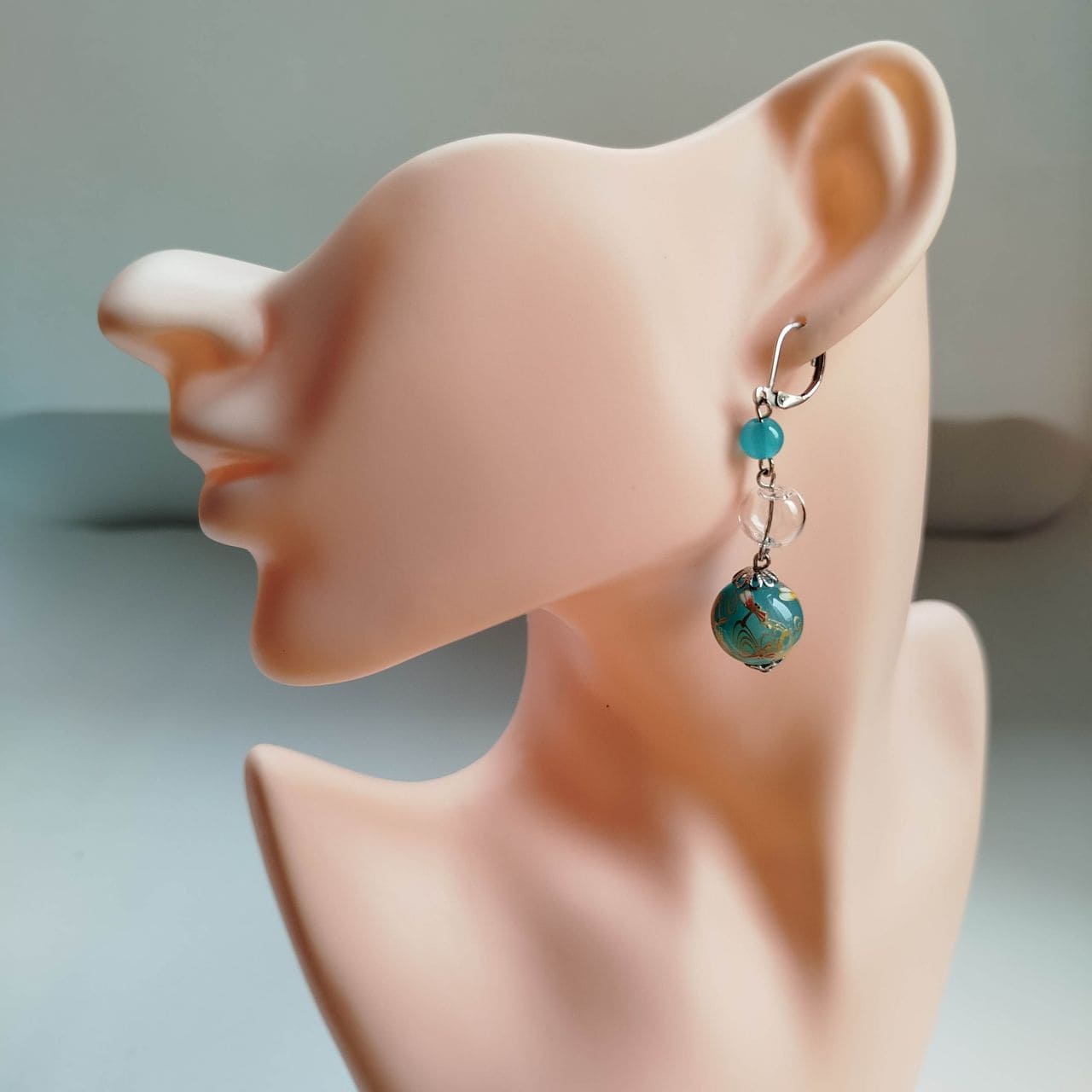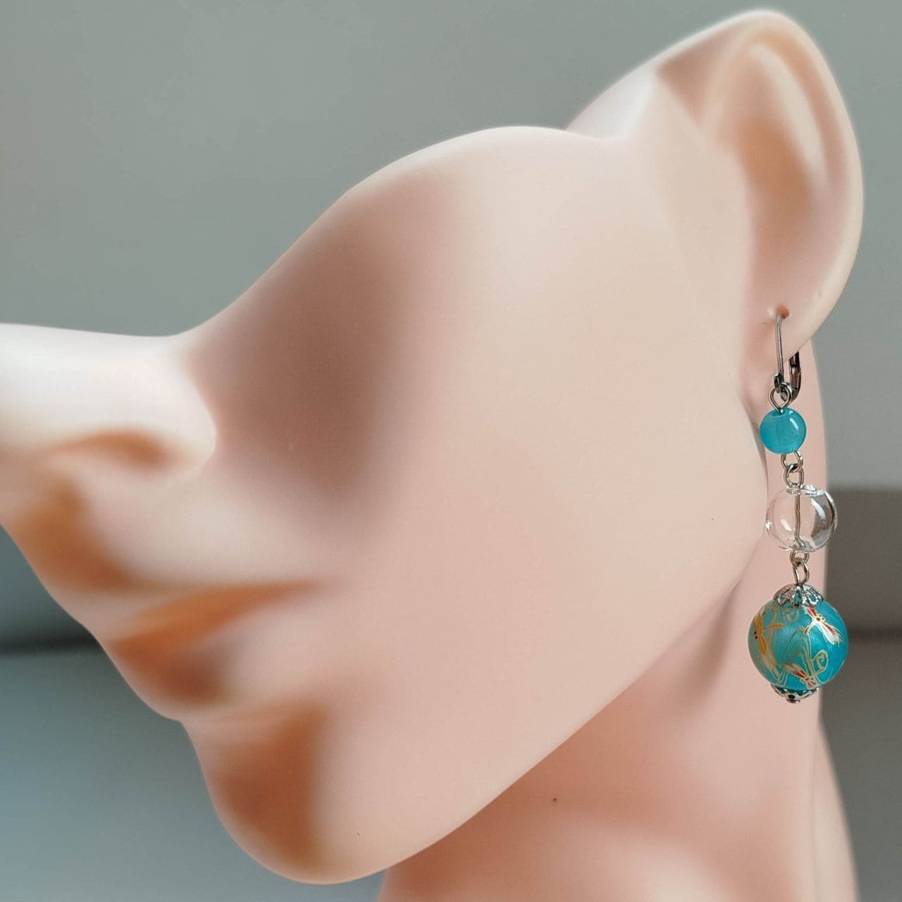 The design combines a 6 mm light blue acrylic bead, a 10 mm hollow blown glass bead, and a 14 mm transfer-decorated bead with a dragonfly pattern. The transparent glass element adds lightness and clarity, creating a cool and airy impression. Total length: approx. 5.8 cm.
