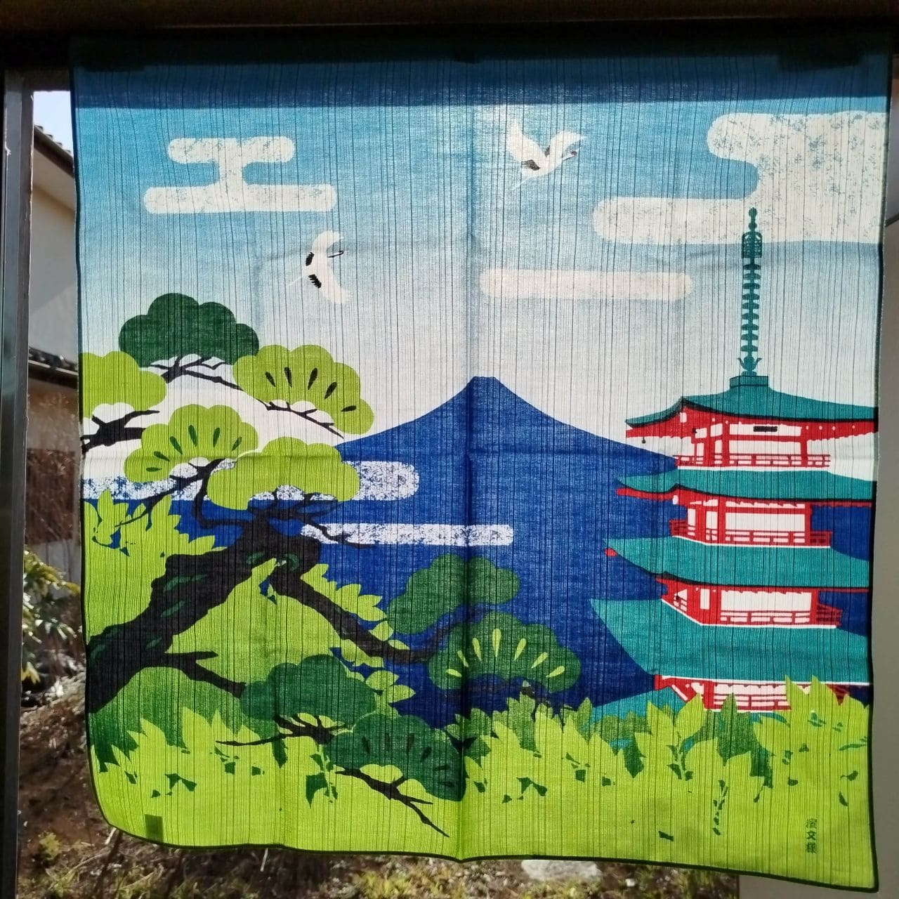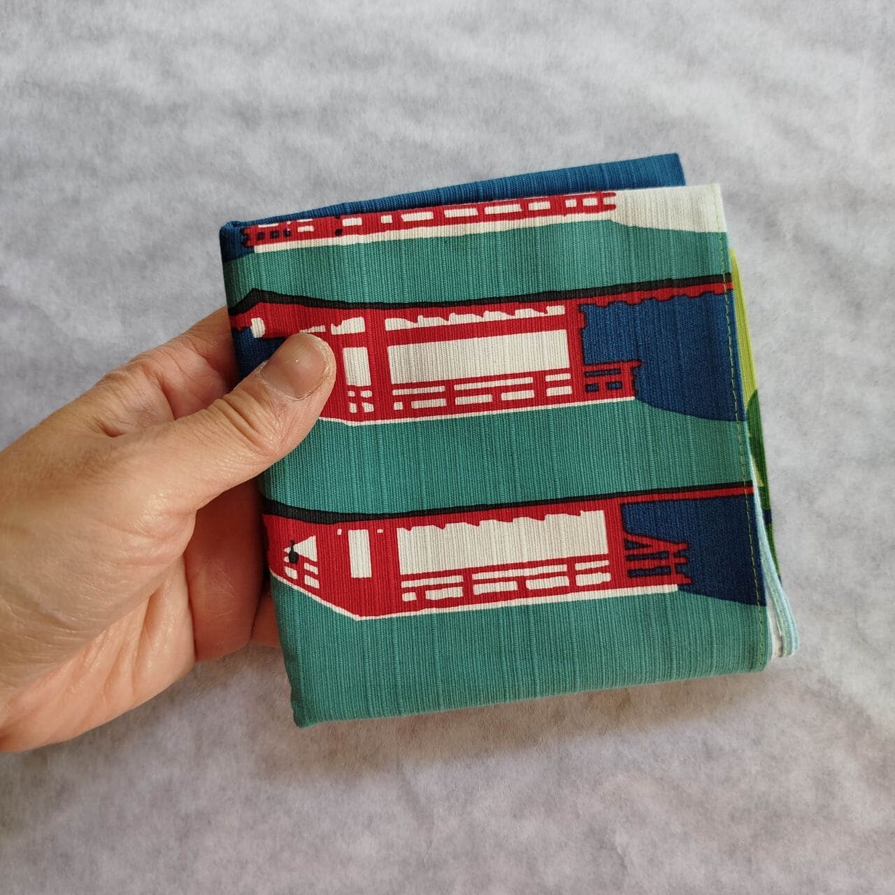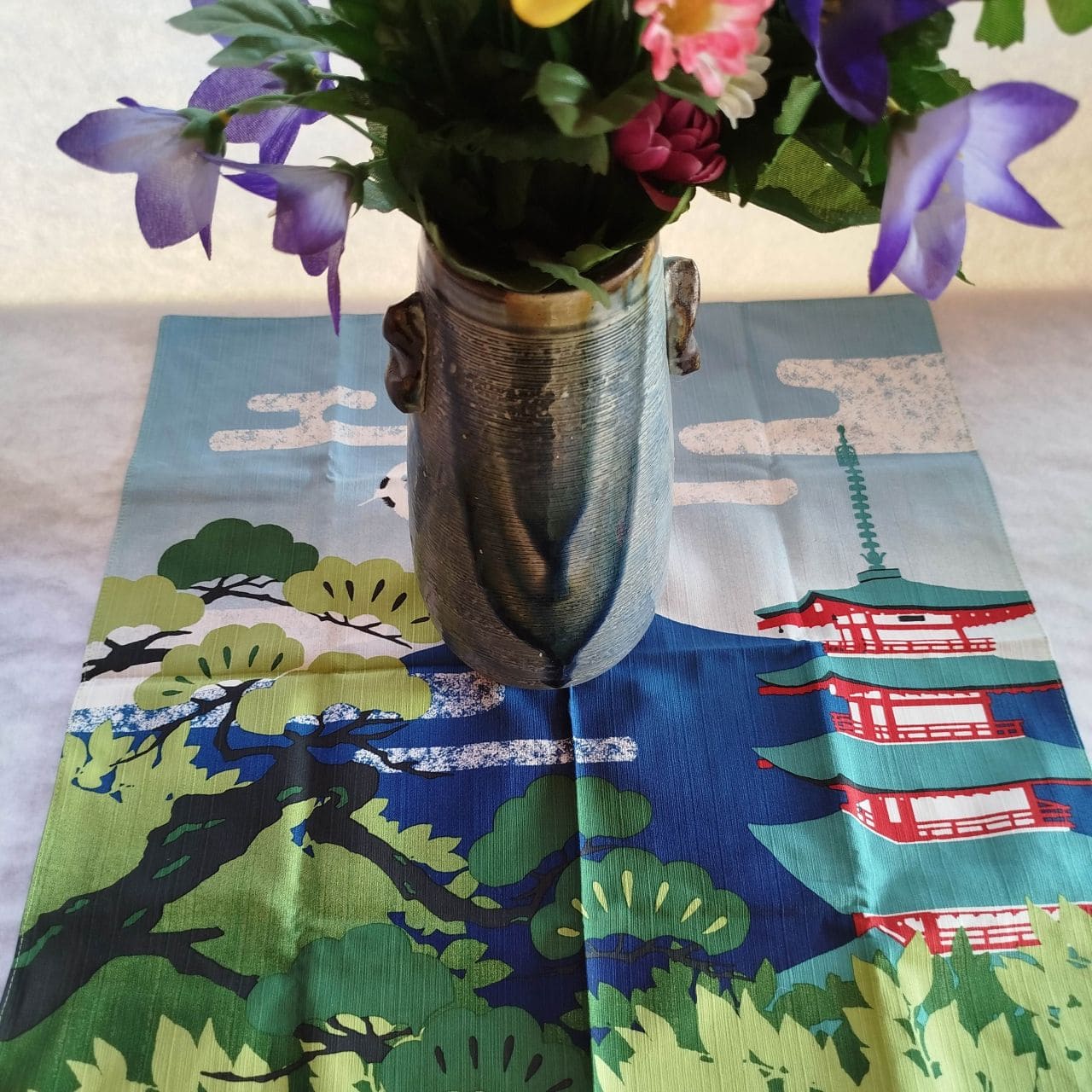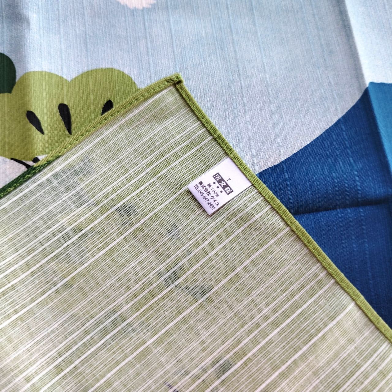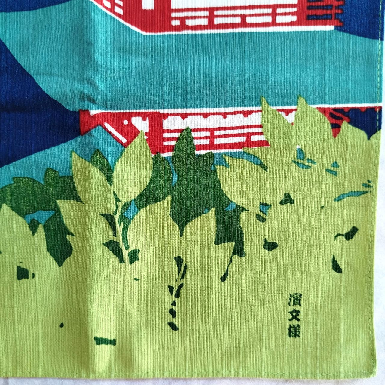 This furoshiki features a beautiful design of a five-story pagoda surrounded by lush green pine trees, with graceful cranes flying above — a combination of auspicious symbols in Japanese culture. The vivid green tones evoke the brightness and vitality of summer, bringing a sense of calm and nature into everyday life.