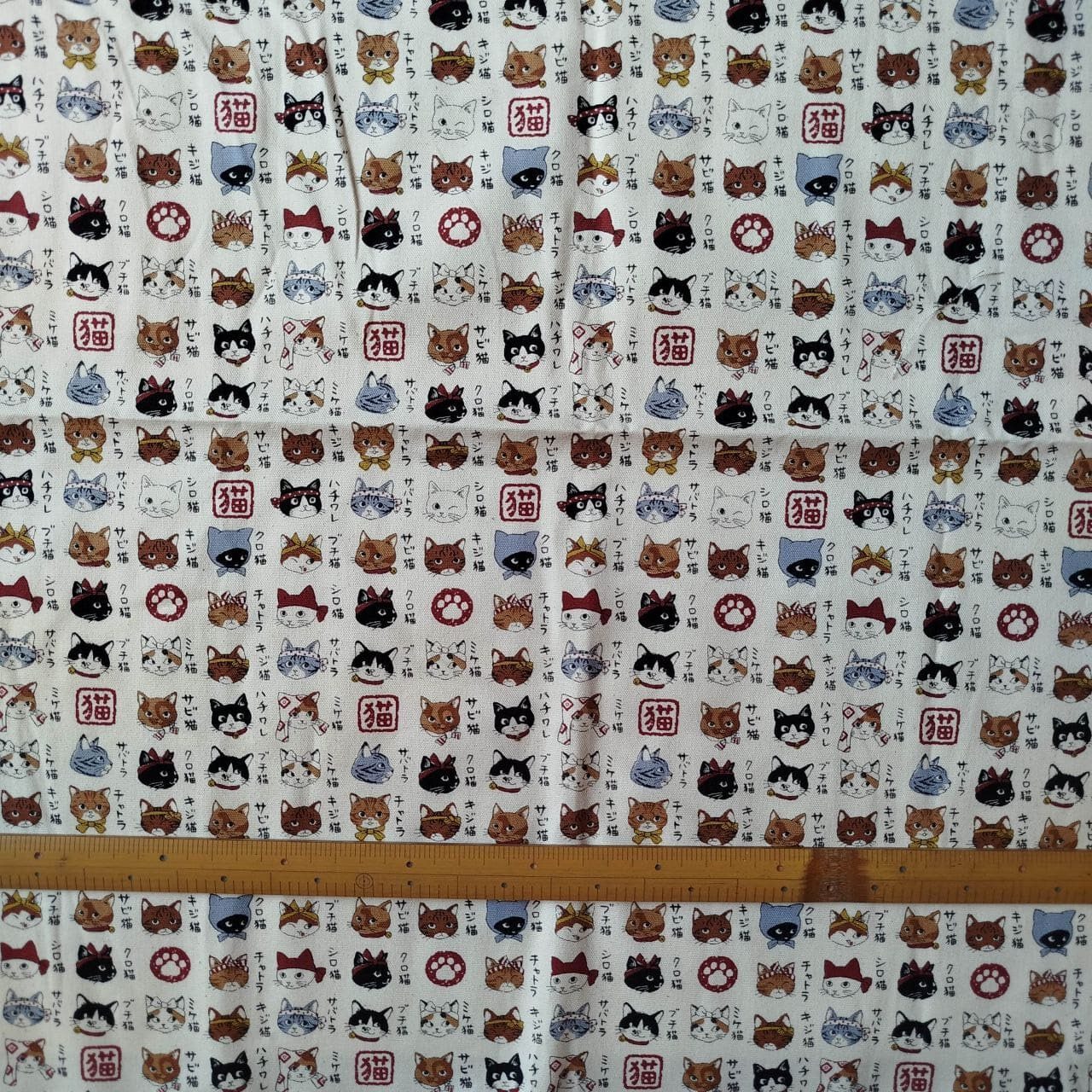 A charming design showing many different Japanese cat faces, each labeled with their names in Japanese.