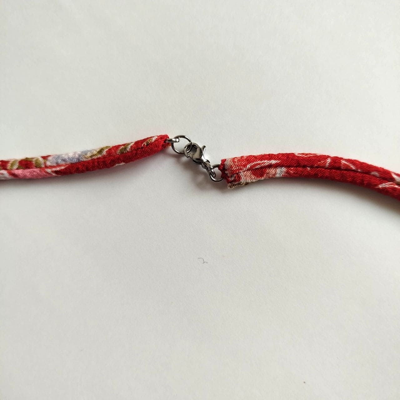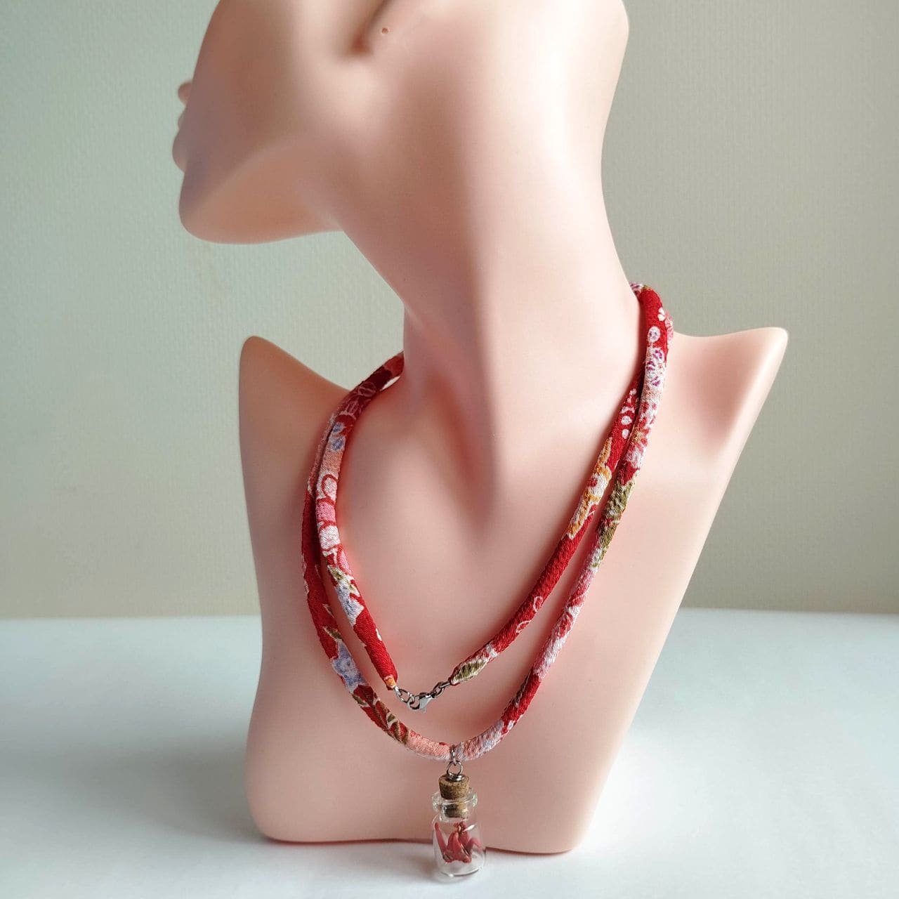 Instead of a metal chain, this necklace uses a soft chirimen cord (85 cm), adding warmth and a traditional Japanese touch.