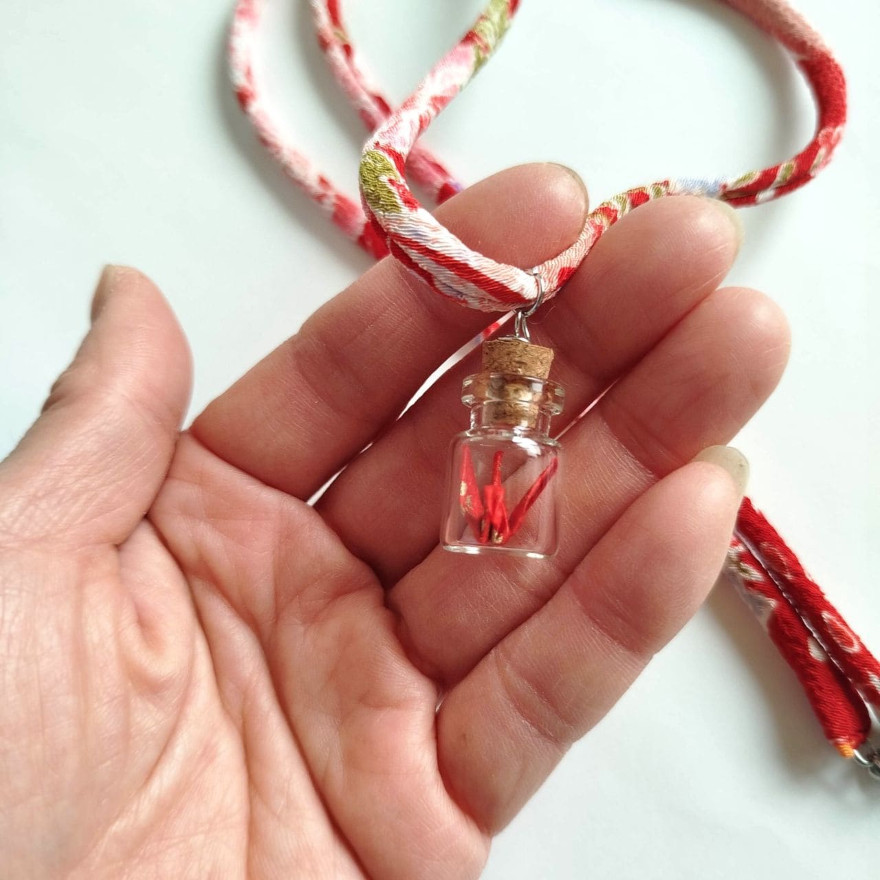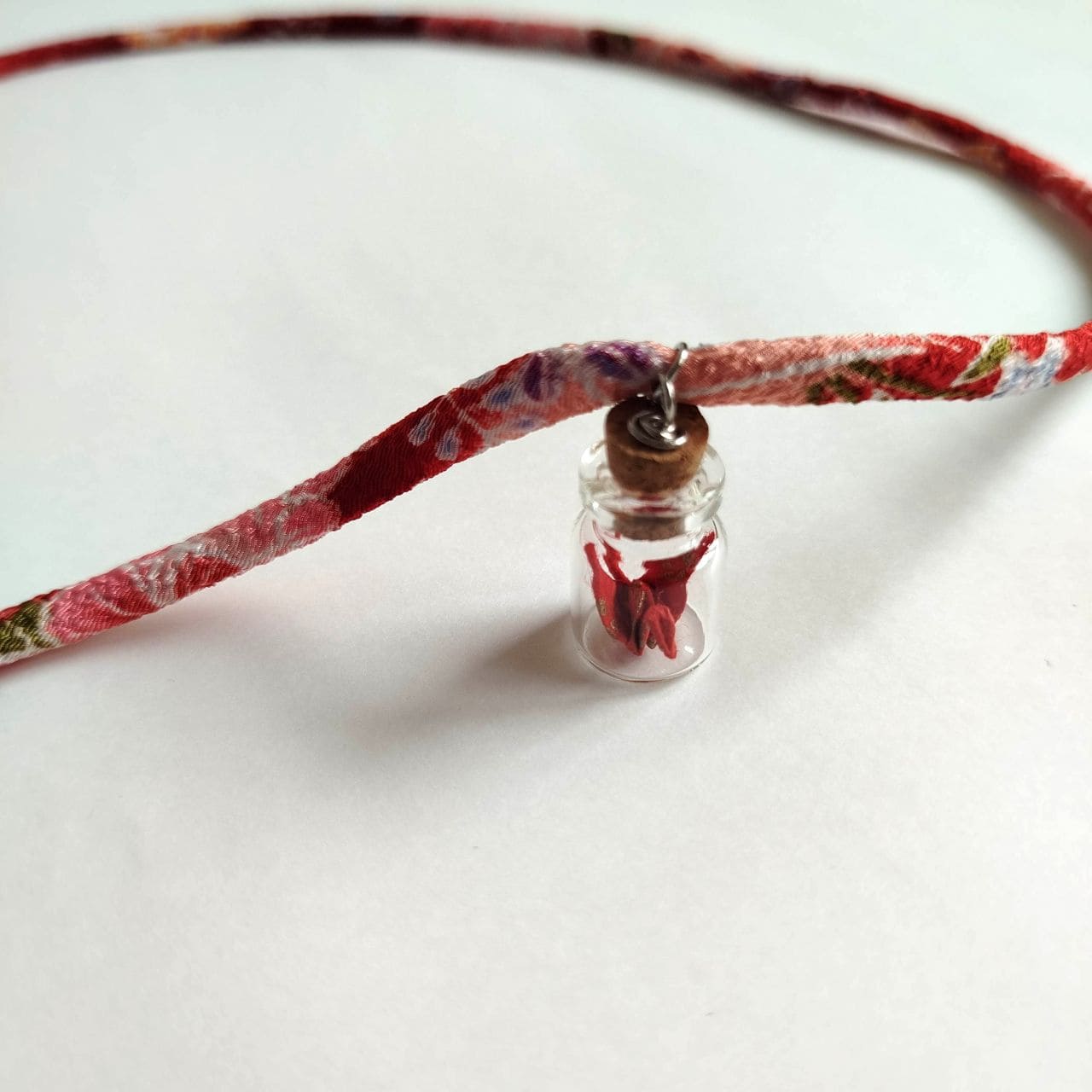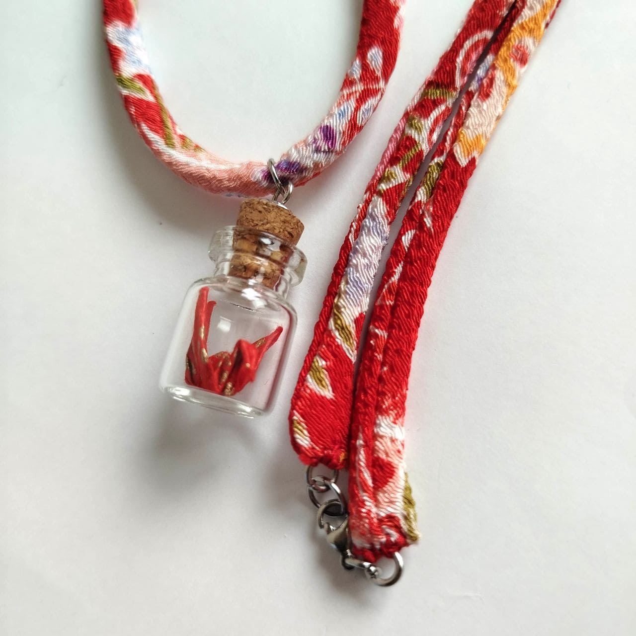 Inside this small bottle lies a carefully folded crane made from handcrafted washi paper by Asai Chourakuen in Kyoto, adorned with hand-printed golden nadeshiko (Japanese Pink) flowers dancing across a vivid red background.